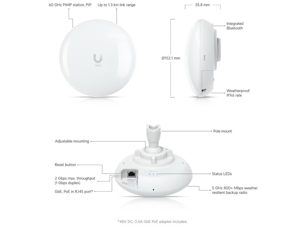 Ubiquiti Wave Pico 60 GHz + 5 GHz, 2 Gbps max. Throughput, 1Gb RJ45 port, Bluetooth