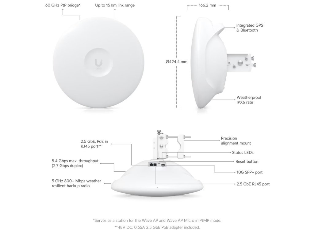 Ubiquiti Wave Professional 60 GHz + 5 GHz, 2 Gbps max. Throughput, 1 GbE RJ45 port, Integrated GPS & Bluetooth