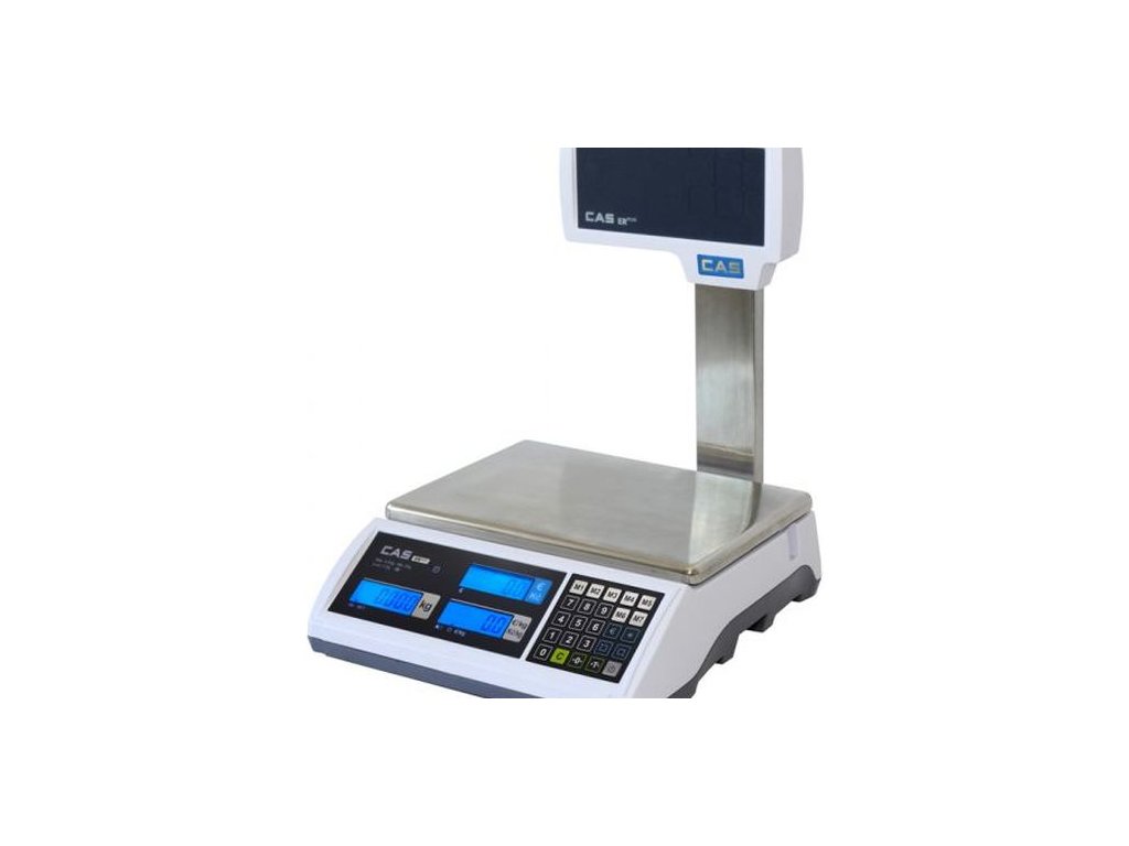Obchodní váha CAS ER PLUS 6 kg, s nožičkou, zákaznický dispej na nožce, se skládá z plastového skeletu s nerezovou vážní miskou. Předností váhy je atraktivní vzhled a kvalitní gumová tlačítková klávesnice. Váha je napájena AC 230V přes adaptér a provoz váhy zabezpečuje vestavěný akumulátor na cca 140 hodin. Obchodní váha je určena pro použití v obchodním i v neobchodním styku na vážení při prodeji zboží s výpočtem ceny (potraviny, zelenina apod.).