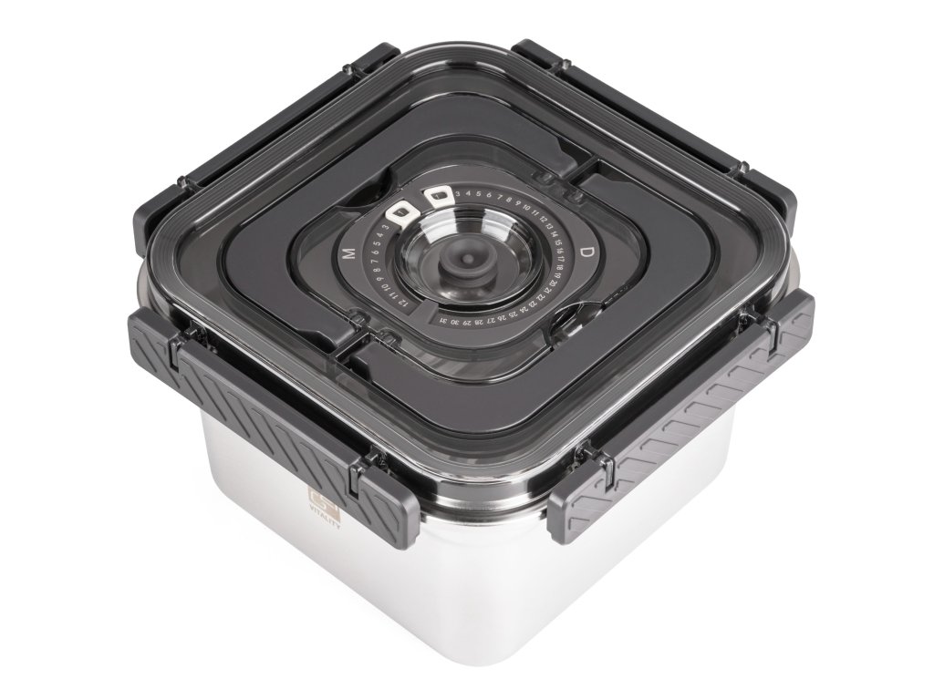 Víko z BPA Free plastu je vybavené vakuovacím ventilem a praktickým nastavitelným ukazatelem data. Budete tak vědět, kdy byly potraviny vakuovány nebo do kdy se mají spotřebovat. Pro uvolnění vakua a otevření dózy stačí jemně zmáčknout ventil uprostřed víka.