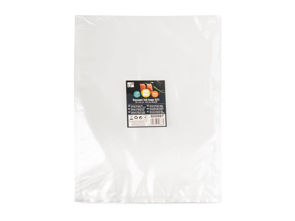 Hladké vakuovací sáčky G21 o rozměrech 30 x 40 cm jsou díky své vysoké pevnosti a kvalitnímu provedení vhodné nejen pro prodloužení trvanlivosti potravin vakuováním a jejich uchovávání v ledničce nebo v mrazáku, ale využijete je i k vakuování surovin pro sous-vide vaření.