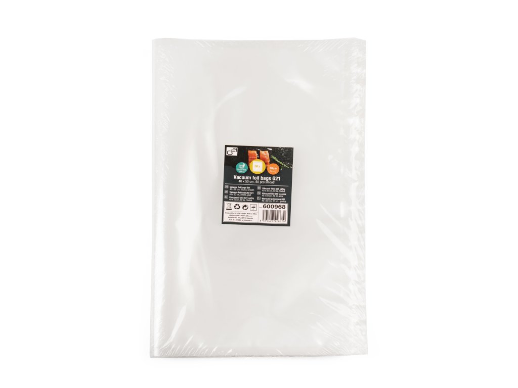 Hladké vakuovací sáčky G21 o rozměrech 40 x 50 cm jsou díky své vysoké pevnosti a kvalitnímu provedení vhodné nejen pro prodloužení trvanlivosti potravin vakuováním a jejich uchovávání v ledničce nebo v mrazáku, ale využijete je i k vakuování surovin pro sous-vide vaření.