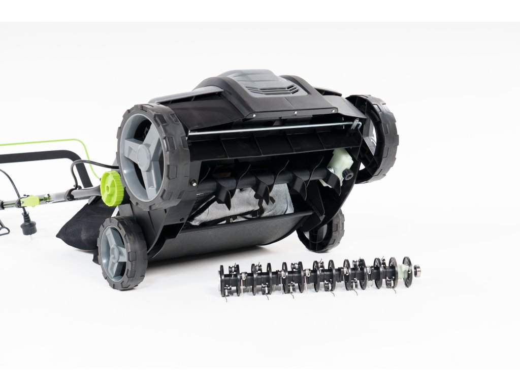 Pracovní hloubku si nastavíte pomocí páčky v rozsahu od 9 do -13 mm, stroj tedy můžete použít na nejrůznějších typech půdy. Do sběrného koše se vejde až 55 litrů trávy. Pohodlnou práci vám zajistí měkké rukojeti. Na těle vertikutátoru také najdete madlo pro pohodlnější přenášení stroje.