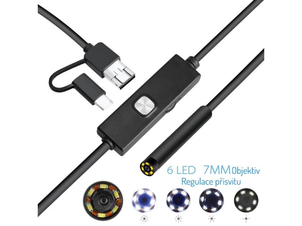 Voděodolná USB kamera s rozlišením VGA CMOS, kabelem 5m a zrcátkem pro kontrolu nepřístupných částí, pro počítač, tablet i mobil. Specifikace: Velikost snímače : 1/9'' Počet snímků za sekundu max : 30 Rozlišení nativní 640x480px Interpolované rozlišení 1280x720px Formát fotografií: JPEG Formát videa: AVI Jas: automatické nastavení dle aktuálních podmínek Průměr pouzdra: 7,3mm - velmi tenké pouzdro umožňuje dosáhnout i do nepřístupných míst Široký zorný úhel pohledu: 70° Vám umožní dobře prohlédnout vše co je potřeba Voděodolnost IP67 umožní prohlížet místa i pod vodou Endoskop slouží k pozorování blízkých předmětů 6LED diod pro dodatečný přísvit 5m tvrdý kabel, který se drží tvar a dosáhne kam potřebujete. Podporované operační systémy :Android, Windows XP/7/8/10 USB a mikro USB konektor Možnost připojit na mobilní telefon s OS Android