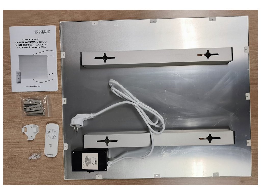 Balení: infrapanel, dálkové ovládání (2× AAA baterie - není součástí dodávky), montážní sada