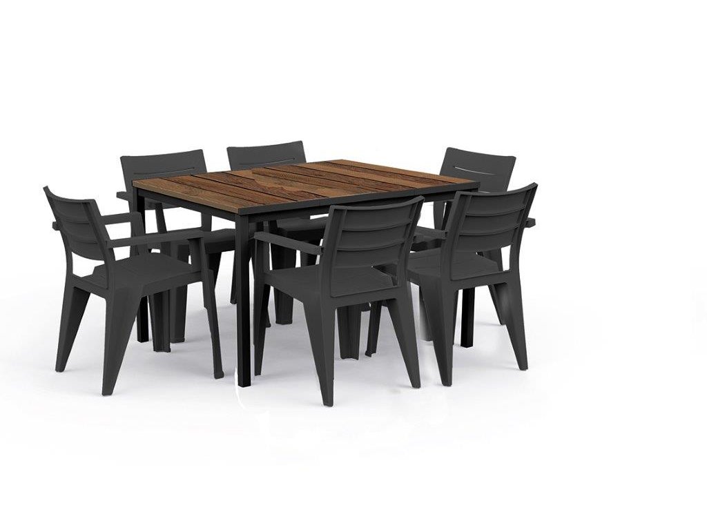 Díky unikátnímu povrchu DecoCoat odolá stůl nepříznivým povětrnostním vlivům a poškrábání. Zároveň si zachovává svou barvu. Textura navíc připomíná skutečné dřevo. Konstrukce je vyrobená z kovu, proto je stůl pevný a odolný.