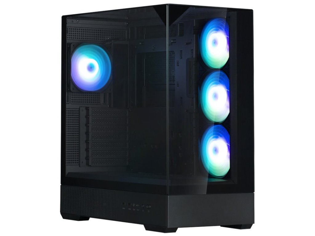 Skříň je vybavena 4× ARGB ventilátory (3× boční, 1× zadní) s RGB kontrolerem pro efektní osvětlení a podporuje grafické karty až 420 mm dlouhé. Pokročilá správa kabelů s 33mm prostorem a praktické bezšroubové uchycení všech skleněných panelů zajišťují snadnou montáž i údržbu.