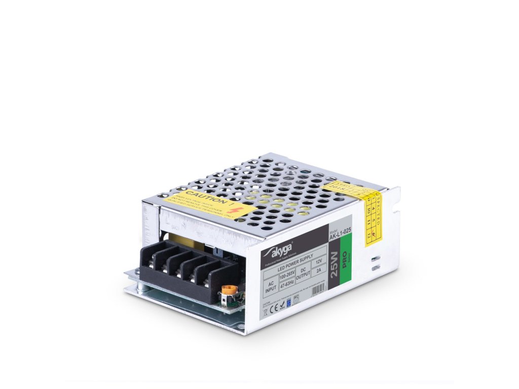 Akyga® AK-L1-025 je 25W napájecí zdroj pro průmyslové automatizační systémy, řízení strojů a osvětlení založené na technologii LED, který se používá při napájení LED pásů, LED žárovek, LED panelů, RGB LED ovladačů a dalších elektronických zařízení poháněných 8,5 - 14V DC, který je regulován potenciometrem. Aktuální kapacita 2A umožňuje dodat například 5m LED pás s parametry 4,8 W/m.
